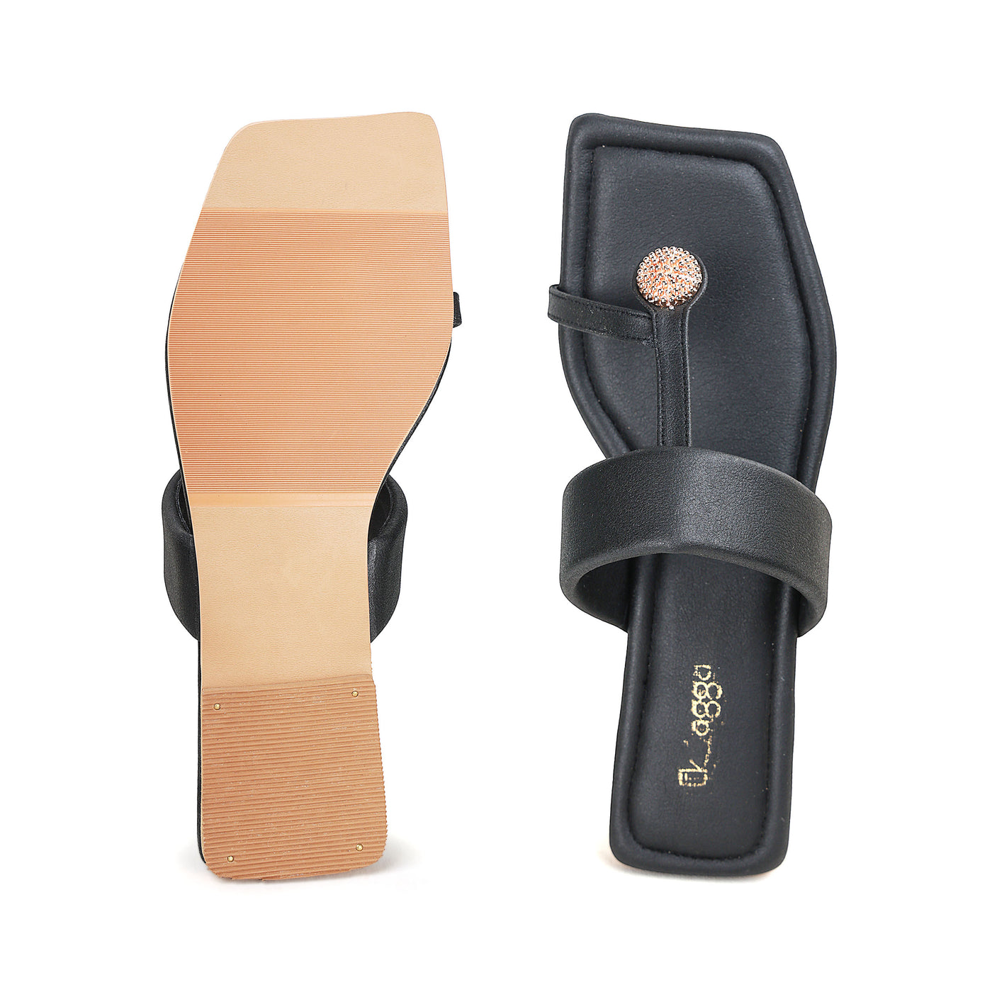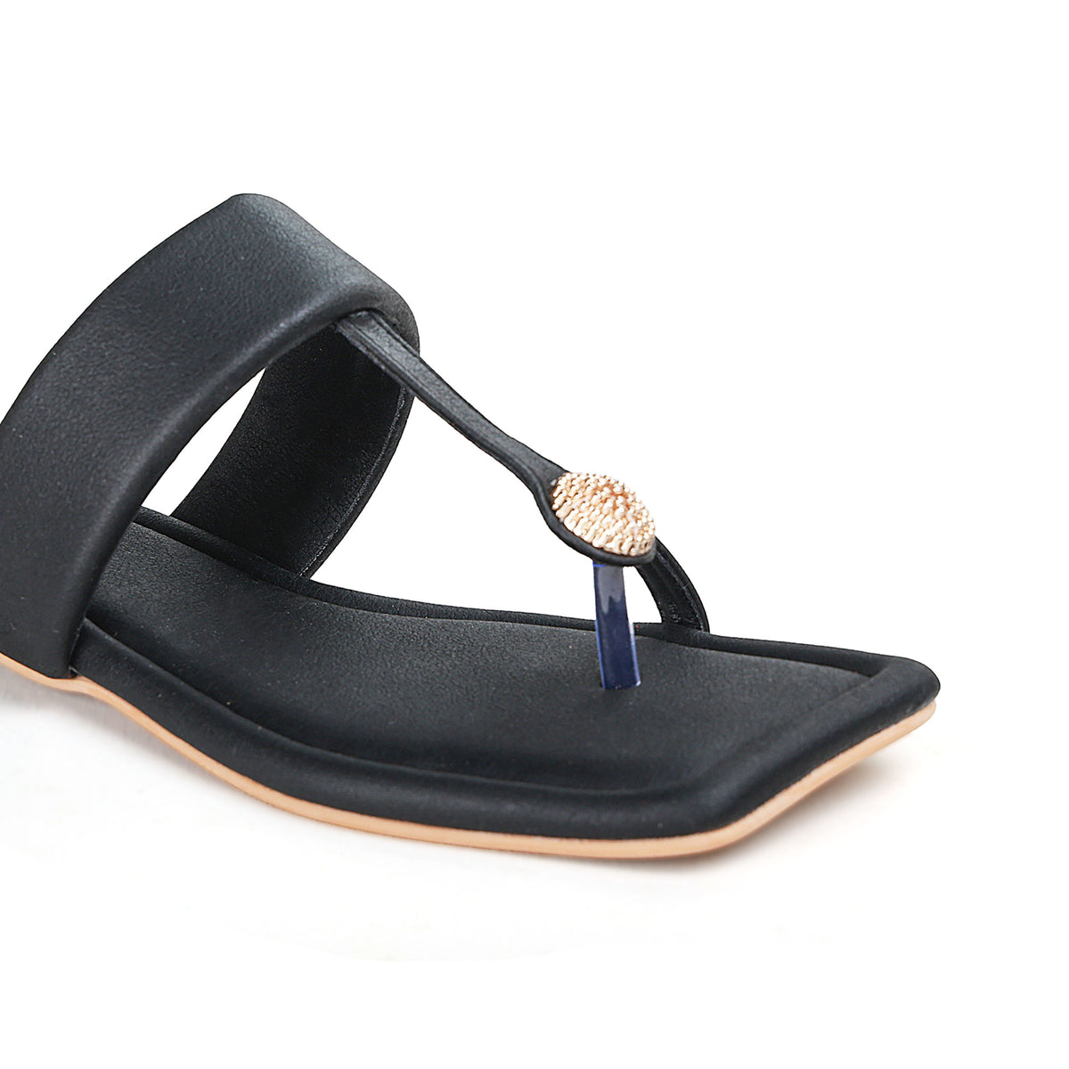 Product Details- Material: PU(Polyurethane) Vegan Leather Type: Flat Closure Type: Open toe Colour: Black Occasion: Casual/Party Shoe Sole: Synthetic Sole Sheet